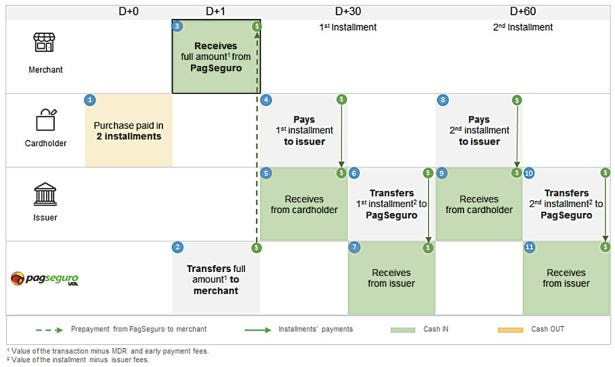 O ciclo de recebimentos dos vendedores em Brasil para transações de cartões de crédito é de 30 dias e o mercado oferece muitas opções de parcelamento, dificultando o recebimento dos vendedores. O PagSeguro encurta estes ciclos oferecendo diversas opções de recebimentos mais rápidos para seus vendedores.