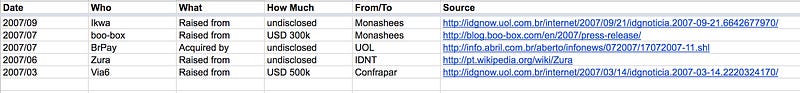O formato do Google Drive era legal, pois ele permitia que outras pessoas incluíssem novos deals e, aos poucos, a base de dados foi crescendo. Para incluir um negócio, as únicas coisas que você precisava fazer era incluir um link para a notícia e a data da transação.