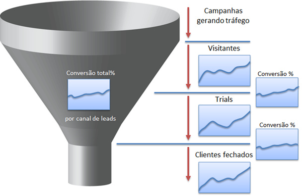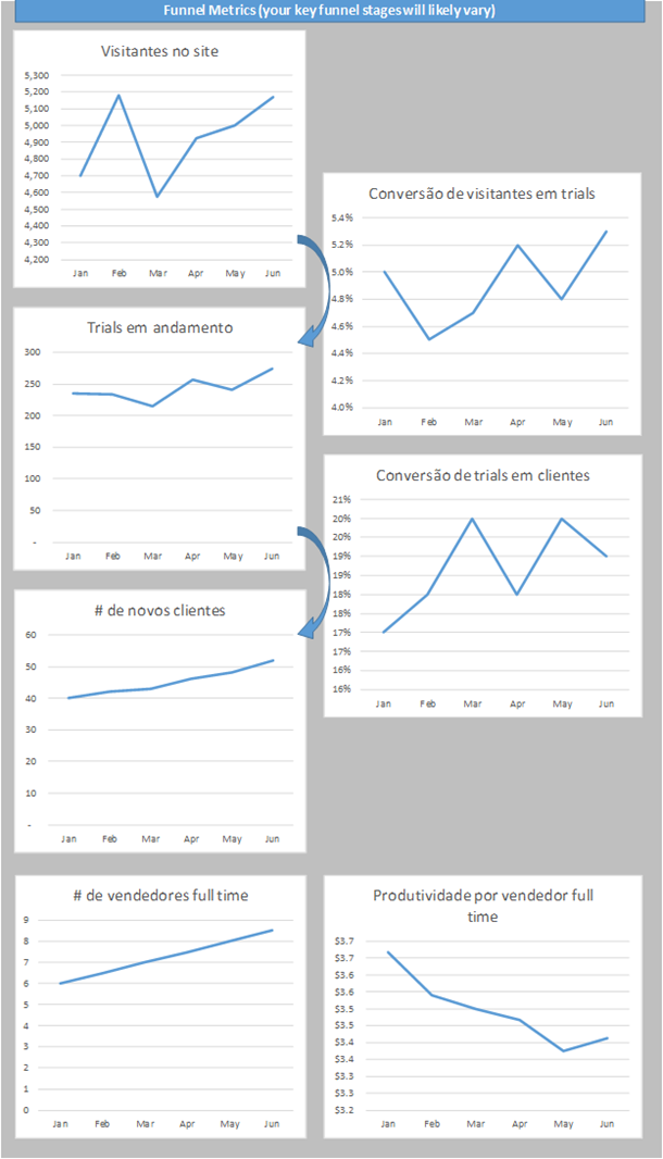 No diagrama acima, que também aparece no painel de métricas, mostramos um processo de vendas de três fases muito simples, com visitantes vindo a um web site e, uma parte deles se inscrevendo para um período de testes (trial). Depois, alguns dos trials são convertidos em vendas. Como você pode ver no painel de métricas, queremos rastrear o número de visitantes, trials e negócios fechados. Nossa meta deve ser aumentar esses números com o tempo. E também queremos rastrear as taxas de conversão, com o objetivo de melhorá-las com o tempo.