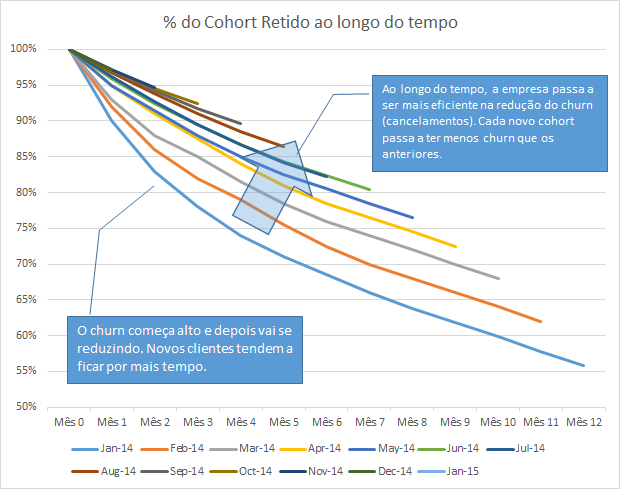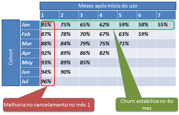Assim, se você toma providências para reduzir o churn nos primeiros meses (ex: novas funcionalidades, on boarding simplificado, treinamentos, etc.), poderá medir os resultados rapidamente. A análise de cohorts te ajuda a comparar meses entre si. Na tabela acima, existe uma grande melhoria na taxa de churn no primeiro mês, caindo de 15% para 4%.