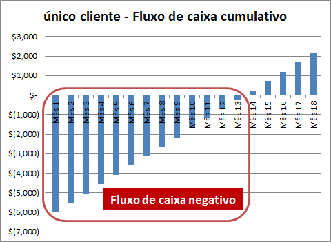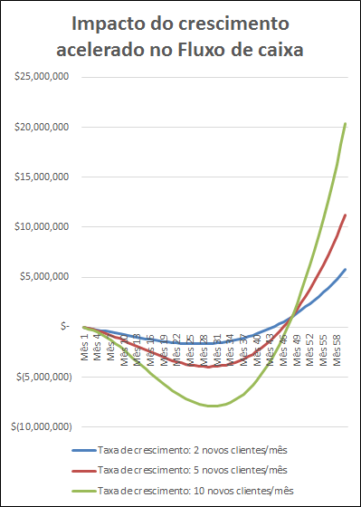 Se ocorre um rombo no fluxo de caixa para um cliente apenas, imagine o que acontecerá se começarmos realmente bem e adquirirmos muitos clientes ao mesmo tempo? O modelo mostra que o rombo de fluxo de caixa se aprofunda, se aumentarmos a taxa de crescimento do número de clientes.
