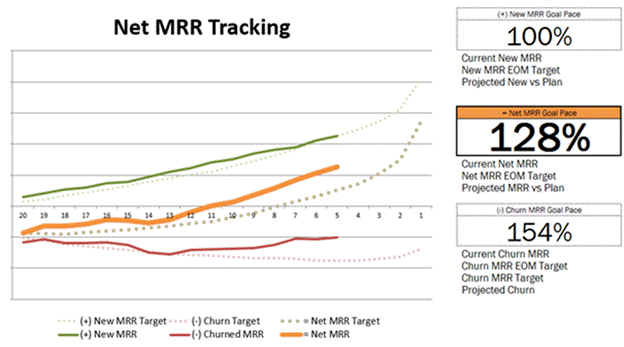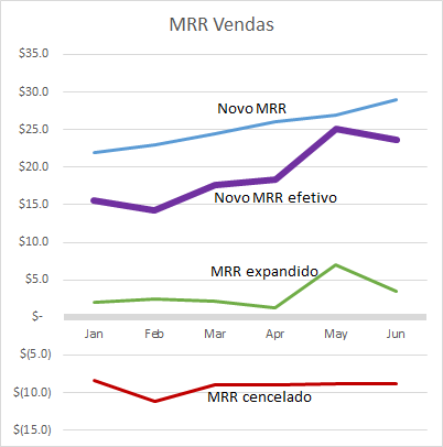 Olhando este gráfico diariamente, nós podemos tomar providências imediatas se estivermos indo mal num mês ou trimestre. Promoção de serviços, desafios de vendas e promoções são ajustes que fazemos para atingir nossas metas. (Neste modelo, nós combinamos MRR cancelado e MRR adicionado em uma linha, de MRR perdido).