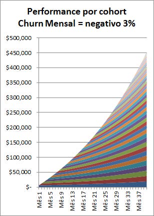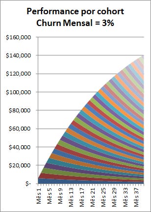Para ajudar a ilustrar o poder de churn negativo, dê uma olhada nos seguintes gráficos que mostram como grupos se comportam com 3% de churn, e, em seguida, com 3% de churn negativo. (Uma vez que esta é a primeira vez que usamos a palavra cohort, deixe-nos explicar o que significa. Uma cohort é simplesmente uma palavra chique para denominar um conjunto de clientes. No mundo SaaS, ela é usada geralmente para descrever o grupo que se juntou em um determinado mês. Então, haveria a cohort de janeiro, de fevereiro, etc em nossos gráficos abaixo e uma cor diferente é usada para o cohort de cada mês, para que possamos ver como eles variam com base na taxa de churn.)