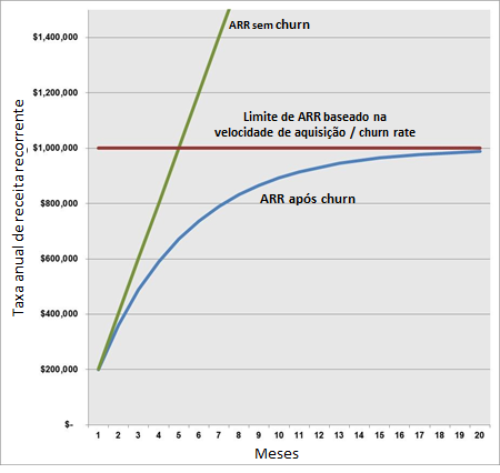 Um aspecto freqüentemente negligenciado do churn é que a taxa de churn, comparado à taxa de novas receitas adicionadas, não só define o quão rápido você pode fazer crescer o negócio, mas também o tamanho máximo a que negócio pode chegar (ver gráfico abaixo).