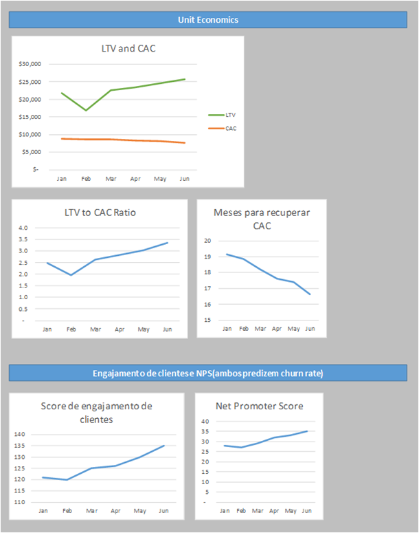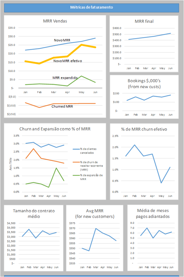 Esta seção deve ser mais útil para os leitores que estão interessados em montar um painel de métricas para ajudá-los a gerir seus negócios SaaS. Para isso, criamos um arquivo do Excel para uma empresa de SaaS imaginária e incluímos um relatório tradicional numérico em uma aba, em seguida, um painel de gráficos em uma segunda aba (veja abaixo). Estes representam um ponto de vista sobre como fazer isso. Você pode ter uma abordagem muito diferente. Mas espero que isso lhe dê algumas idéias. Eu recomendaria a adição de uma linha pontilhada com o número planejado para todos os gráficos. Isto irá permitir que você veja rapidamente como está fazendo em comparação com seu plano.