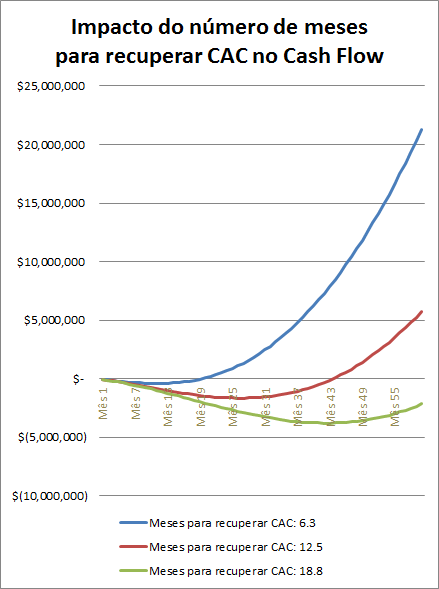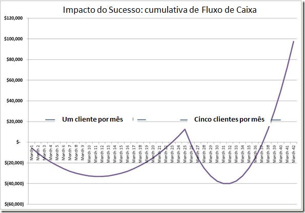 Observe no gráfico de exemplo, que adicionar cinco clientes por mês, produz uma taxa de crescimento muito mais íngreme, mas você terá que passar por um rombo de caixa maior para chegar lá. Muitos gestores e investidores têm dificuldades de lidar com o conceito da necessidade de reintroduzir esse tipo de rombo no caixa depois de ter acabado a curva de perdas e entrar no positivo.