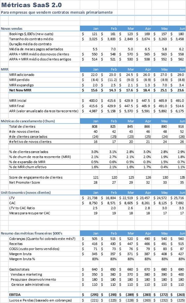 Na maioria das vezes, neste artigo, vamos usar MRR / ACV. Isso significa usar MRR se você é o primeiro tipo de negócio, ou ACV, se você é o segundo tipo de negócio. O exemplo mostrado abaixo assume contratos mensais (MRR). No entanto na planilha para download, há uma aba que mostra o mesmo exemplo para o segundo tipo, com foco em ACV em vez de MRR.