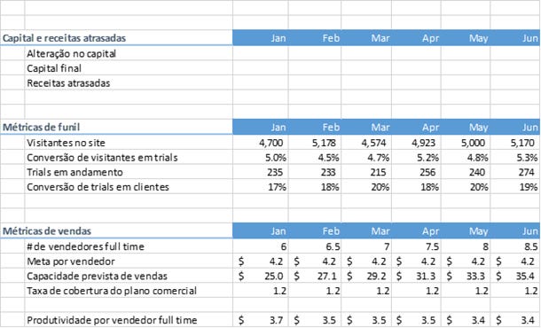 Em muitos negócios SaaS, representantes de vendas têm papel chave no fechamento de contratos. Nessas situações, o número de vendedores produtivos (Capacidade de vendas) será o condutor chave do faturamento. É importante trabalhar de trás pra frente partindo de qualquer previsão que for feita, para assegurar que há suficiente capacidade de vendas. Tenho visto muitos negócios perderem seus alvos porque falharam em contratar vendedores suficientes cedo o suficiente.