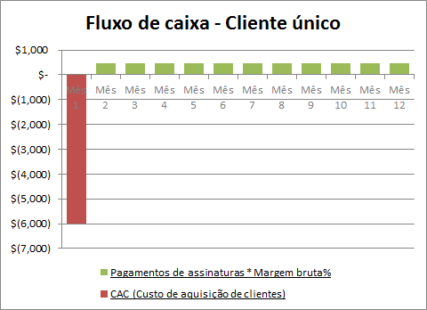 Em muitas empresas de SaaS, isso também se traduz em um problema de fluxo de caixa, já que elas geralmente dependem que o cliente pague mês a mês. Para ilustrar o problema, construímos um modelo simples de Excel que pode ser encontrado aqui. Nesse modelo, estamos gastando R$6.000 para adquirir o cliente e faturamento chega à taxa de R$500 por mês. Dê uma olhada nestes dois gráficos do modelo: